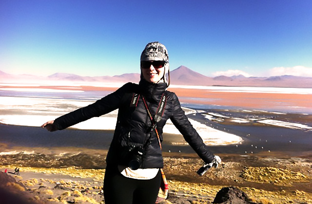 Tammy in ultra down jacket and with a typical Bolivian hat bought locally