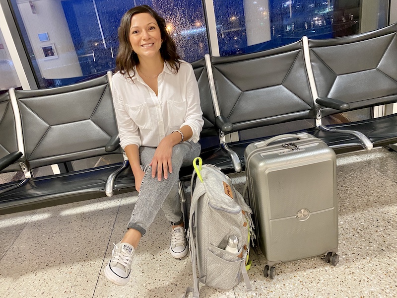 I don’t love wearing sandals when I’m flying because I don’t want to go through security barefoot and I get cold on the plane so closed-toe shoes keep me warmer.