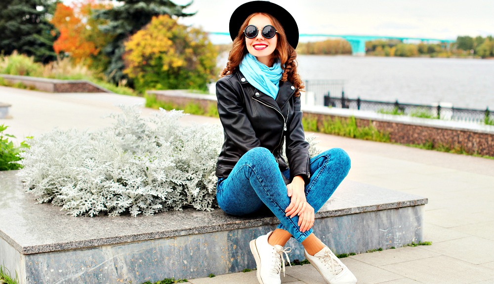 Create a trendy, feminine look by rocking an embroidered leather jacket. These jackets add a tailored feel when paired with a fun polka dotted dress or other classic piece. Finish off your outfit with flats and some retro sunglasses for an autumn sightseeing adventure!
