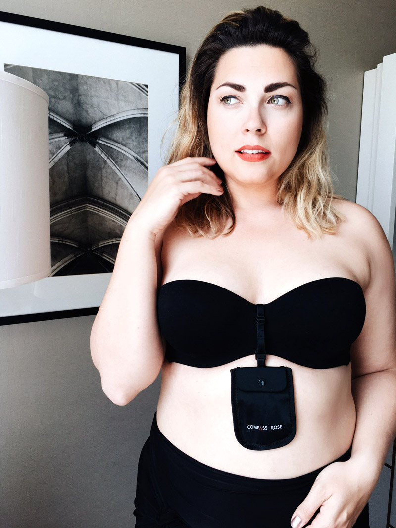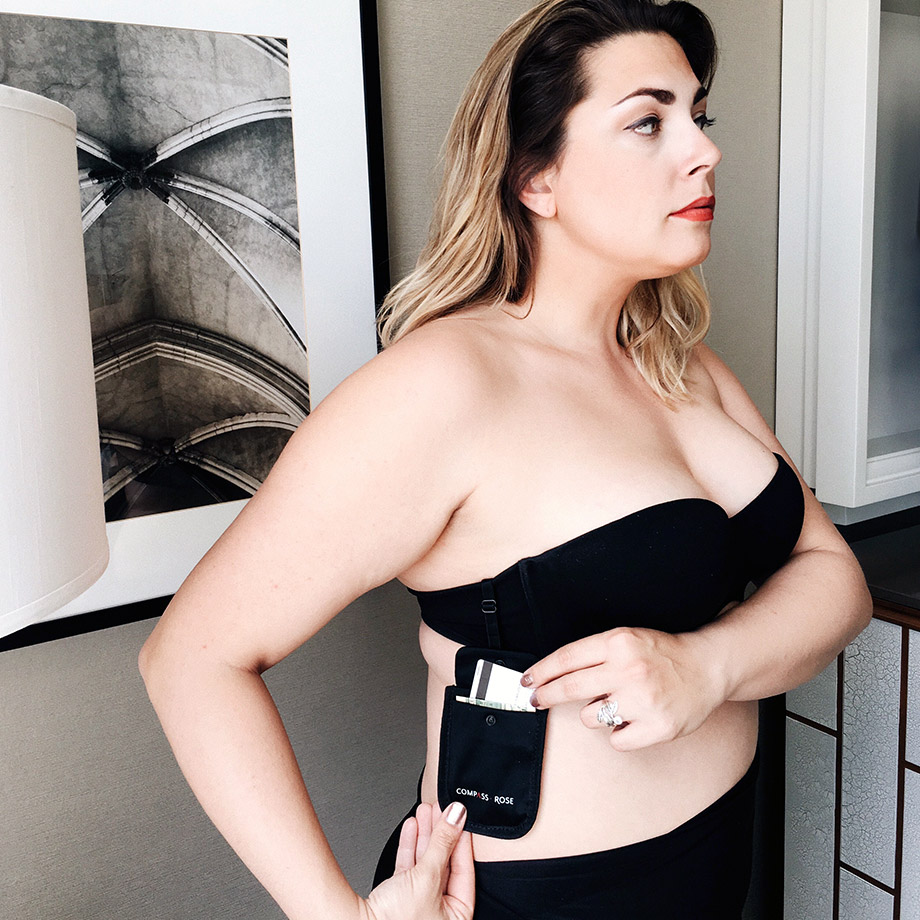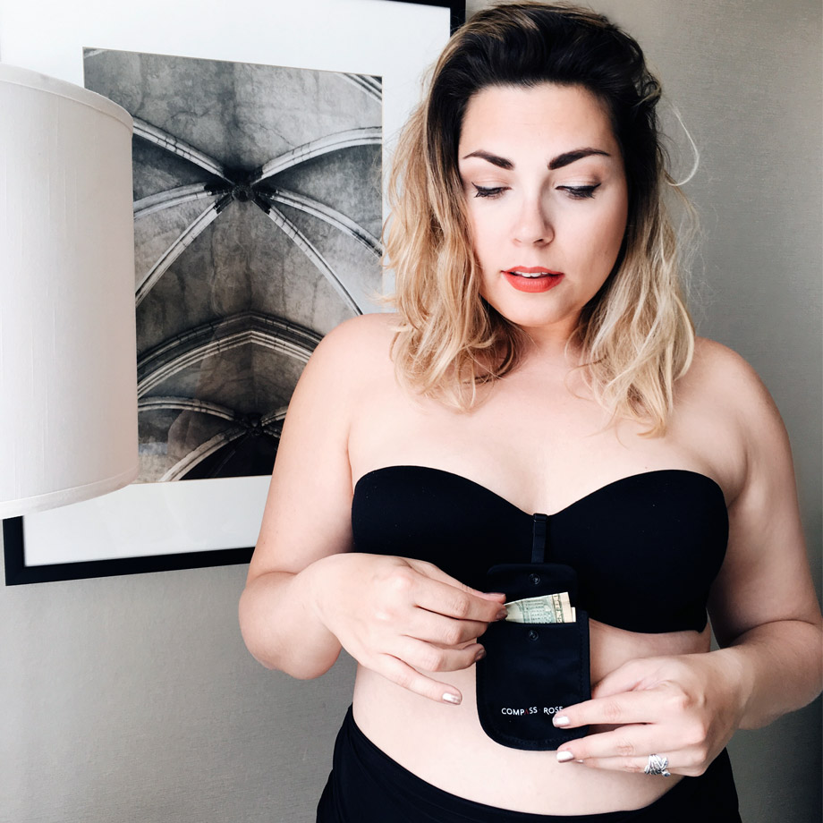 It has an extra long adjustable strap to accommodate a range of bra band sizes. Whether you have an A cup or a DD+ cup, the Compass Rose Secret Bra Wallet is made for you. In the above images, the beautiful Tegan from the Travel Curve shows two ways to wear the bra stash. Tuck it in underneath your bra for extra security – that’s how we wear ours and how we recommend you wear it, too.
